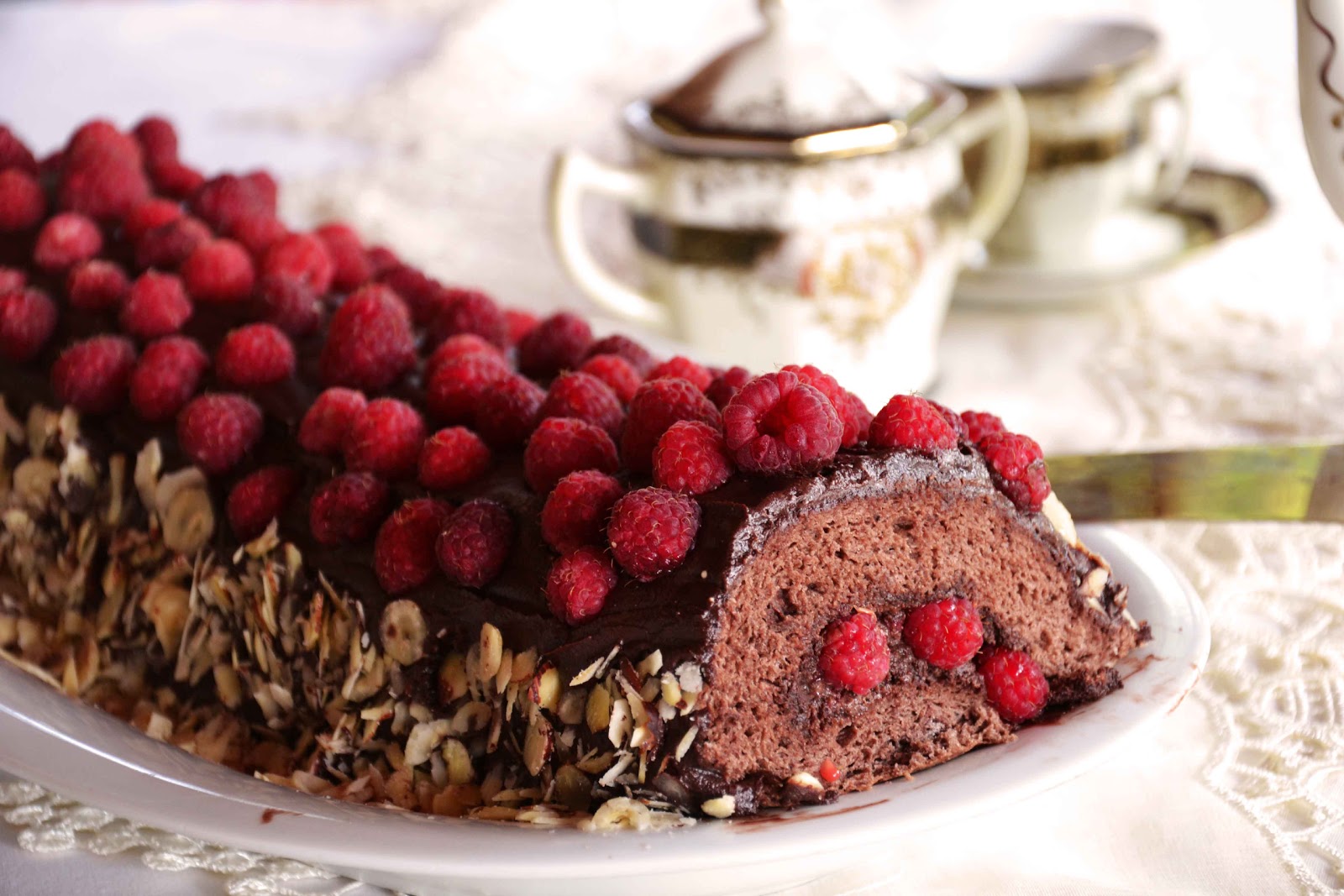 Spread the frosting on the cake (not the whole, leave some for the coating) and add most of the raspberries. Roll the cake up carefully, if it is needed, put it in a foil. This way it will hold its shape. Spread the rest of the frosting on it, use a fork for lines. Add some almonds or chopped nuts for decoration and place the remaining raspberries on top.